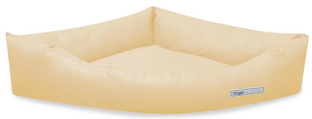 Een fraaie, moderne crème kunstleren hondenmand die speciaal is ontworpen in een driehoekige vorm om in de hoek te worden geplaatst. De hoes is afneembaar en kan in de wasmachine worden gereinigd.