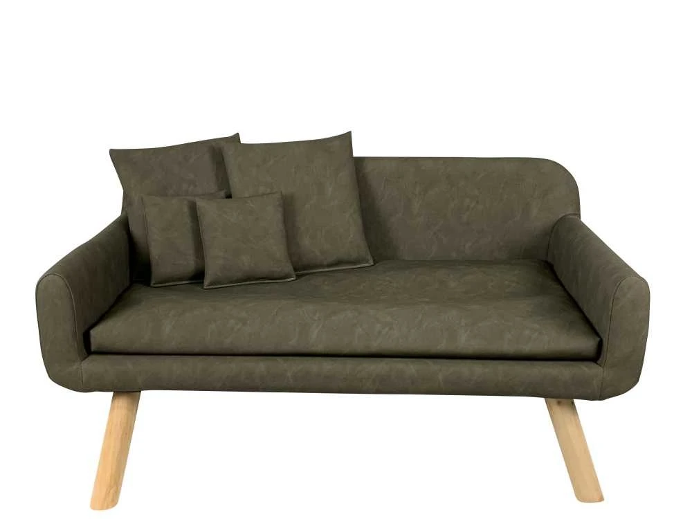 De uitstraling van deze hondensofa doet denken aan een klassieke Engelse leren bank in een mannenkamer. Uw trouwe viervoeter zal zich heerlijk voelen op deze uiterst gezellige dierensofa. De hoes van de hondenbank ziet eruit als echt oud leer maar is eigenlijk gemaakt van onderhoudsvriendelijke stof met een vintage look. Vuil kan meestal gemakkelijk worden weggeveegd. De stevige houten poten bieden voldoende bodemvrijheid en beschermen zo tegen de kou. Het liggedeelte wordt aangevuld met vier sierkussens. Dit product wordt volledig in Duitsland geproduceerd.