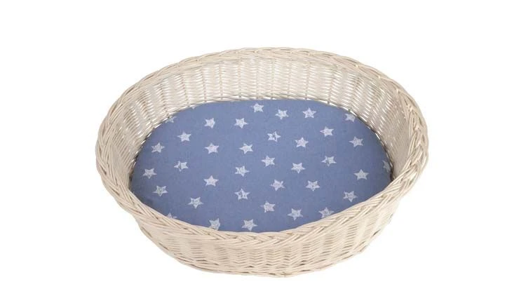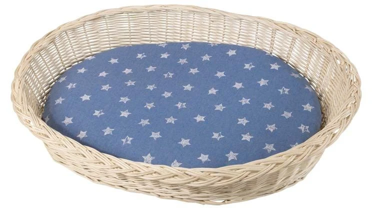 Deze ovale hondenmand is met de hand gemaakt van gevlochten riet. De witte kleur maakt de mand erg stijlvol in uw interieur. De mand wordt met een blauw kussen geleverd, dat aan beide kanten gebruikt kan worden. U kunt dit kussen natuurlijk wassen op max. 30 graden.
